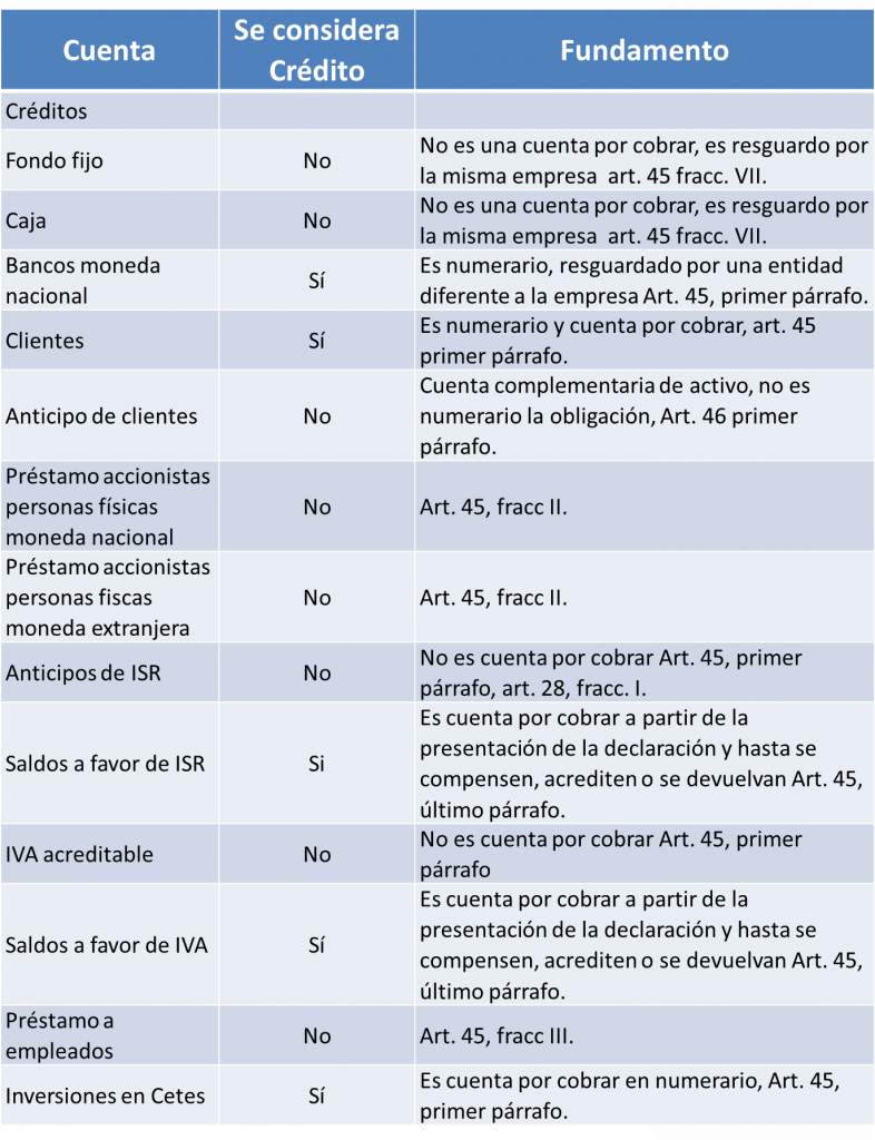 En cuanto al “Impuesto al Valor Agregado (IVA) acreditable” sucede algo similar, ya que no es una cantidad exigible al fisco, sino hasta que se compara contra el IVA trasladado y como resultado sucede un “Saldo a favor de IVA”, hasta en ese momento se podrá considerar crédito, ya que de igual forma se tiene una cantidad en numerario pendiente de cobrar al fisco.