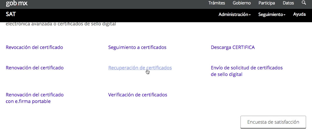 17. Vuelve a tu navegador y da clic en “Recuperación de certificados”.