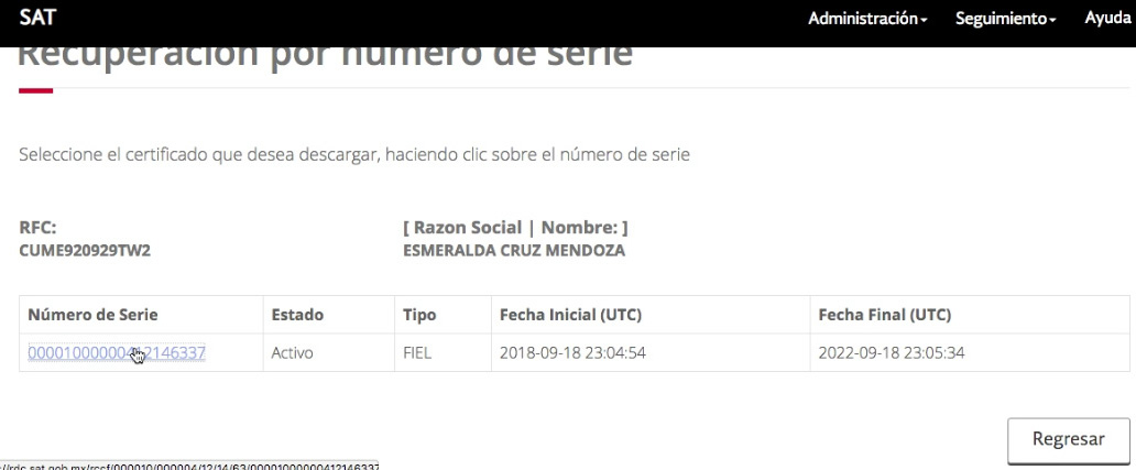 19. Da clic en el número de serie resaltado para descargar tu nuevo certificado.